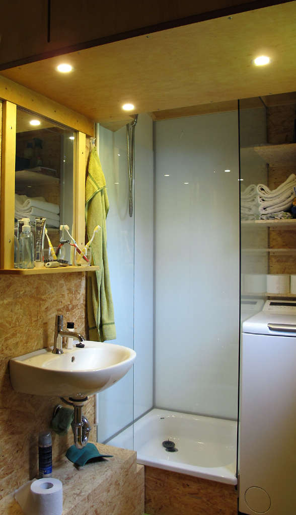 Das Bad in ersten Bild z.B. umfasst 3,1 m² und enthält eine Trocken-Trenn-Toilette, ein Handwaschbecken, eine Einbaudusche mit Sicherheitsglas und emaillierter Stahlbrausewanne sowie eine Waschmaschine (Energieeffizienzklasse A+++, 40cm breit). Über dem Waschtischspiegel befindet sich ein 170-L-Wassertank.